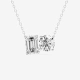 Experience the perfect harmony of brilliance and sophistication with our Round and Emerald Cut Moissanite Necklace. This stunning two-stone pendant showcases a dazzling round moissanite paired with a refined emerald cut stone—each masterfully set in your choice of S925 sterling silver, 10K/14K/18K gold, or platinum.