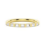 The Baguette Cut Tension Set Moissanite Wedding Band showcases a contemporary design featuring baguette-cut moissanite stones held securely in a tension setting. This striking band balances modern minimalism with radiant sparkle.